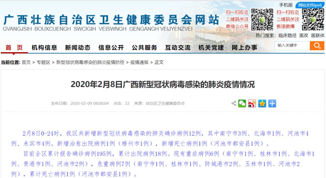 2020年2月9日上午,廣西壯族自治區(qū)衛(wèi)生健康委發(fā)布通報(bào),2月8日0-24時(shí),河池市新增4例新冠肺炎確診病例。報(bào)告死亡病例1例(都安縣病例)。