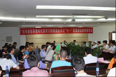 7月2日下午,共青團(tuán)廣西區(qū)委、廣西青年聯(lián)合會(huì)、廣西學(xué)生聯(lián)合會(huì)和廣西區(qū)少工委在南寧召開(kāi)座談會(huì),認(rèn)真學(xué)習(xí)領(lǐng)會(huì)胡錦濤總書(shū)記在慶祝中國(guó)共產(chǎn)黨成立90周年大會(huì)上的重要講話精神,并圍繞進(jìn)一步為黨做好新形勢(shì)下的青年群眾工作進(jìn)行了交流討論。