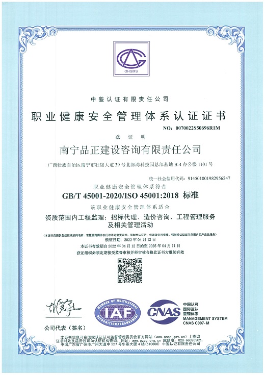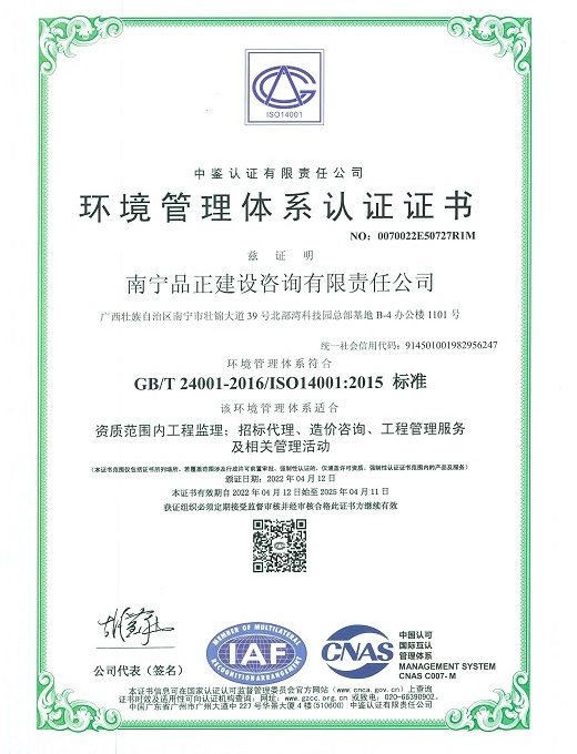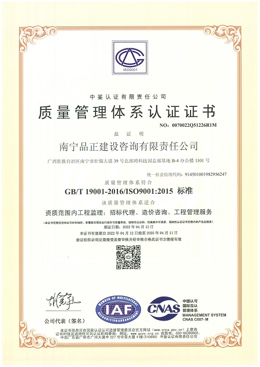 南寧品正于2000年通過ISO9001:2000質(zhì)量體系認證,2009年改版為ISO9001:2008并通過認證;2016年5月同時通過GB/T19001-2008質(zhì)量管理體系、GB/T28001-2001職業(yè)健康安全管理體系認證和GB/T24001-2004環(huán)境管理體系三體系認證。公司長期重視管理體系認證與實際工作的結(jié)合,制定行之有效的檢查及內(nèi)審程序文件,形成了完整的《管理手冊》、《程序文件》、《標準作業(yè)指導書》三個層次的質(zhì)量體系文件。每年定期進行工作質(zhì)量檢查、質(zhì)量體系內(nèi)審和管理評審,確保公司整體質(zhì)量、環(huán)境和職業(yè)健康安全工作的有效性、持續(xù)性,達到規(guī)范化和標準化。