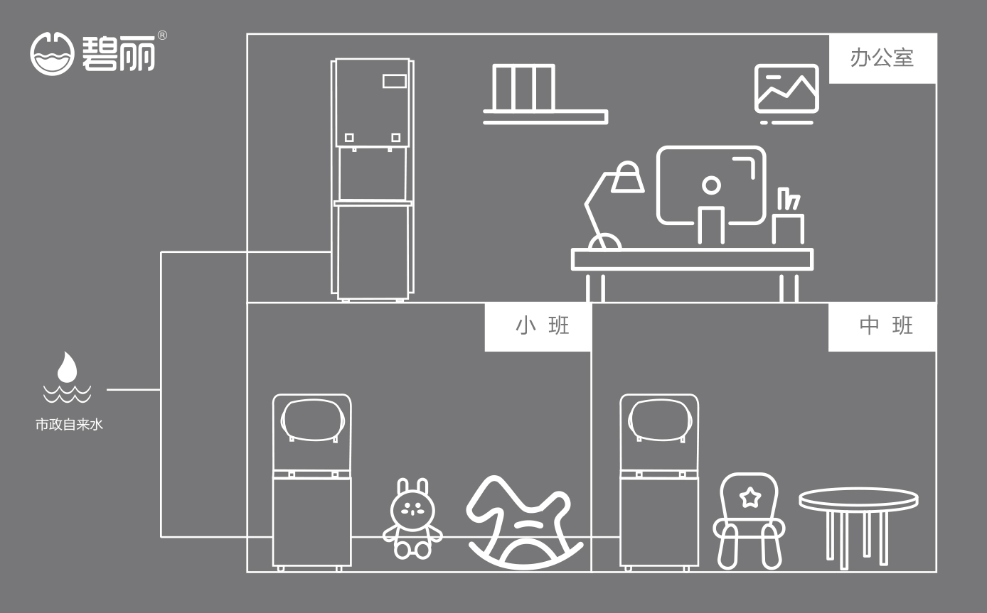 不同的飲水點(diǎn)可根據(jù)實(shí)際使用情況裝配飲水設(shè)備,如教師辦公室可安裝管線機(jī)或飲水設(shè)備或開水器,使用戶能喝上開水、溫開水、純凈水等,幼兒園各班可安裝專用的幼兒園飲水設(shè)備;
