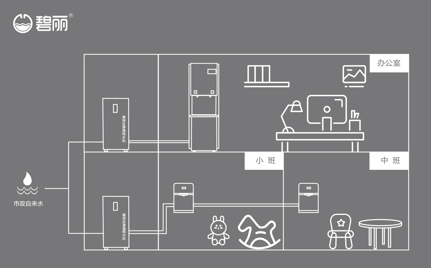 碧麗商用反滲透純水機(jī)將自來水集中處理后,把優(yōu)質(zhì)的純凈水通過專用的供水管道輸送到各飲水點(diǎn);