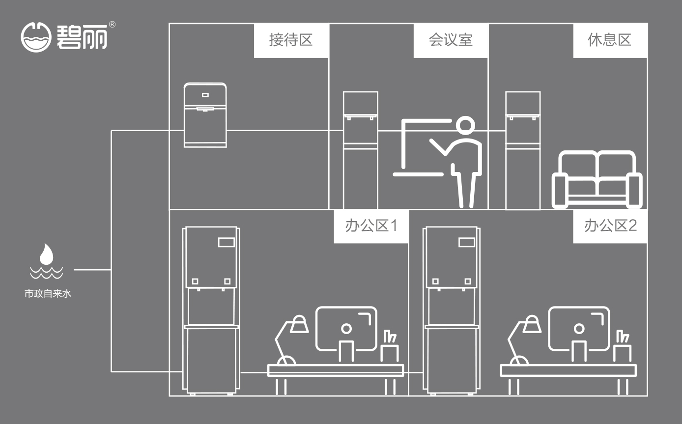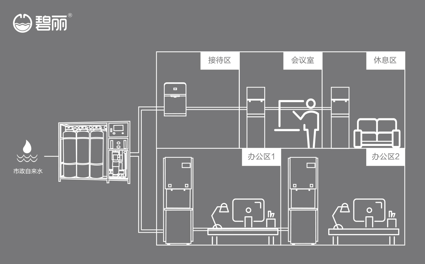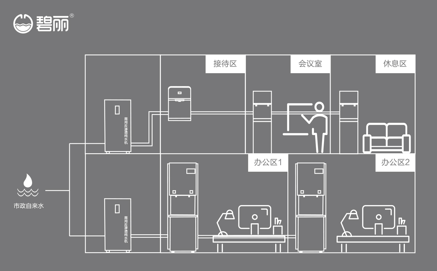 碧麗商用反滲透純水機(jī)將自來水集中處理后,把優(yōu)質(zhì)的純凈水通過專用的供水管道輸送到各飲水點(diǎn);